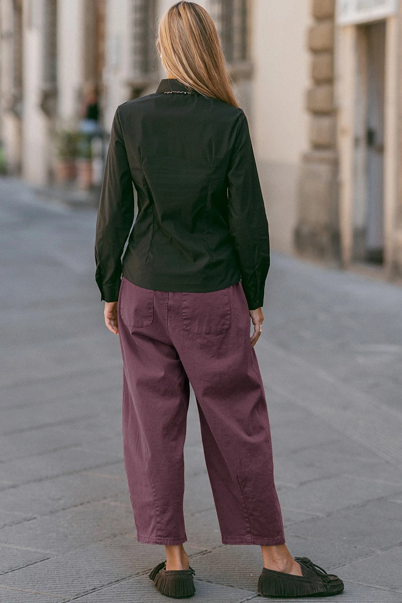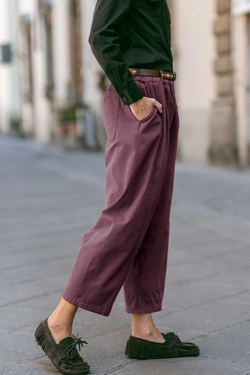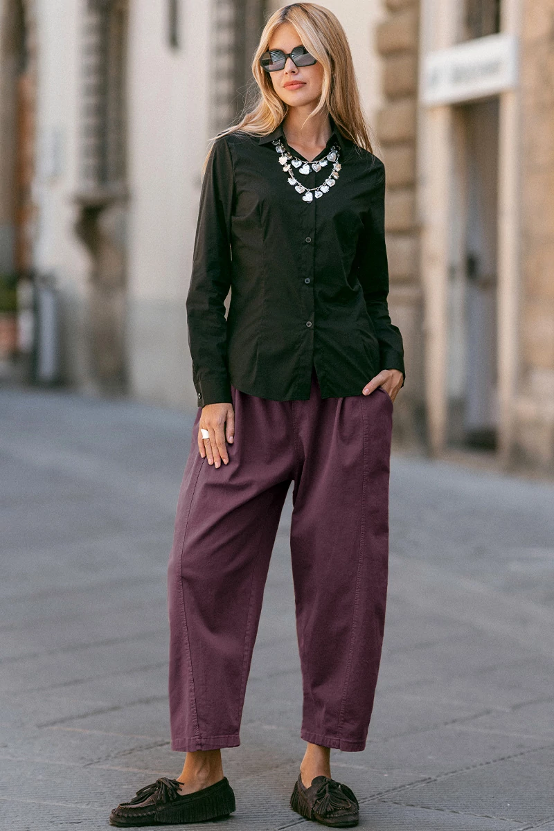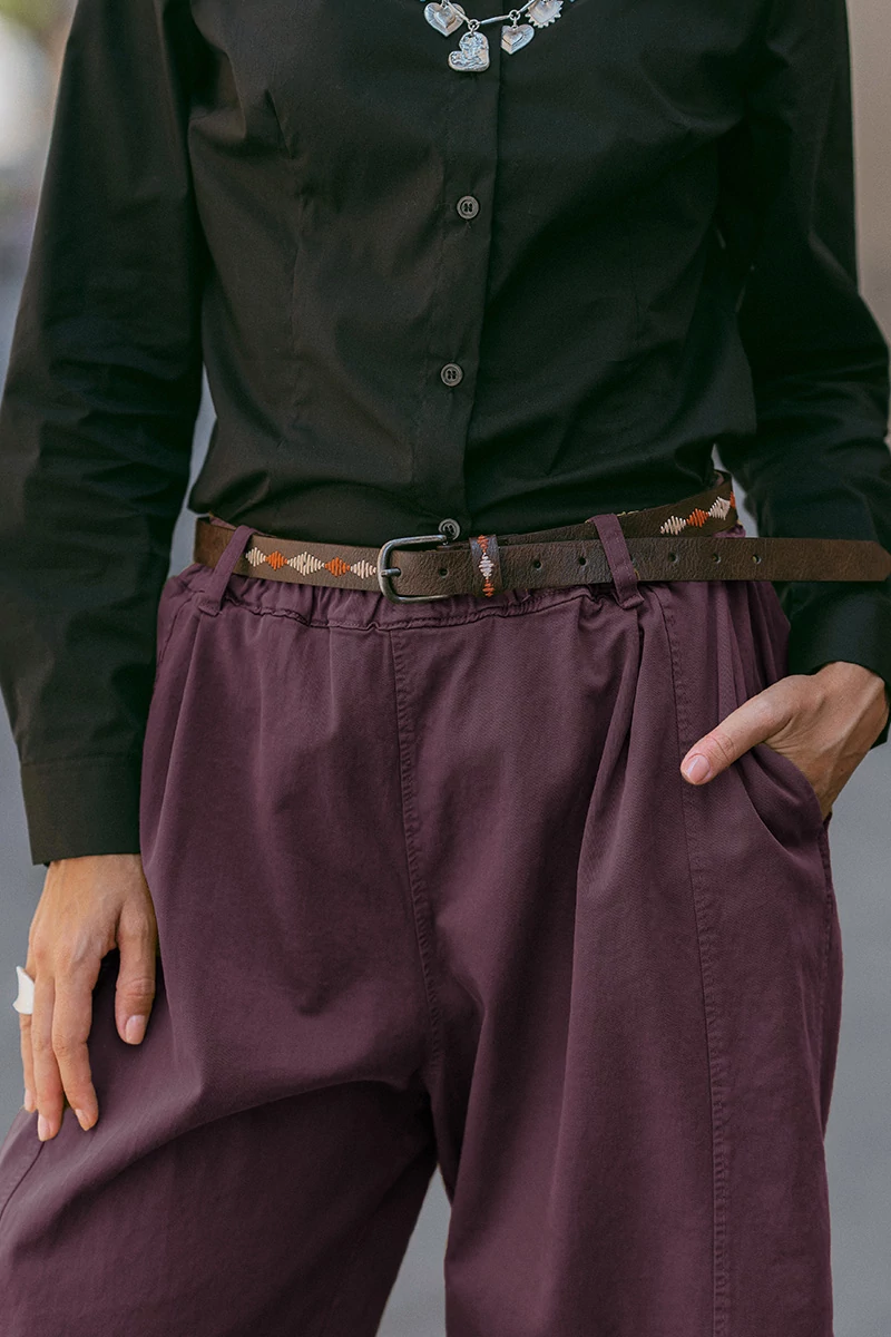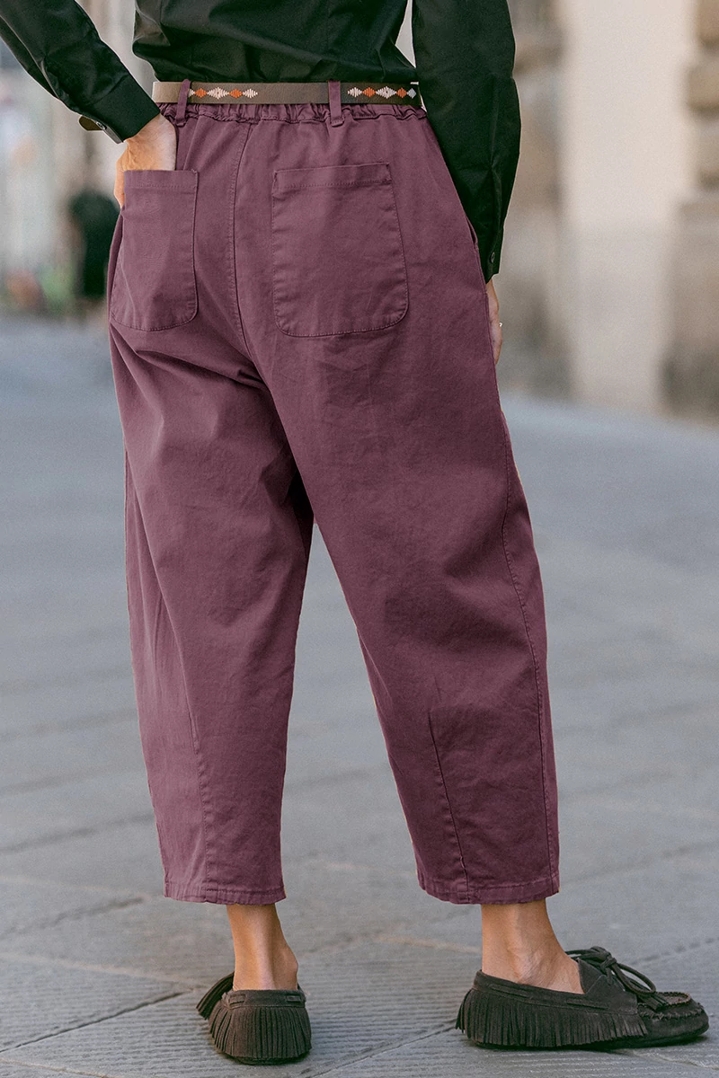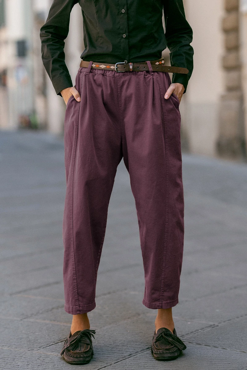 Ballon fazonú nadrág, széles, gumírozott derékkal, övbújtatóval, ajándék övvel, zsebekkel. Anyaga rugalmas, közepes vastagságú vászon.