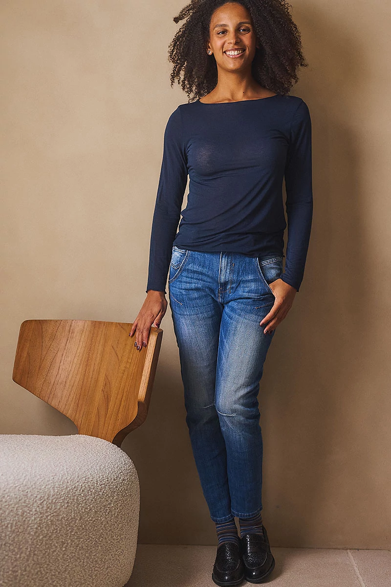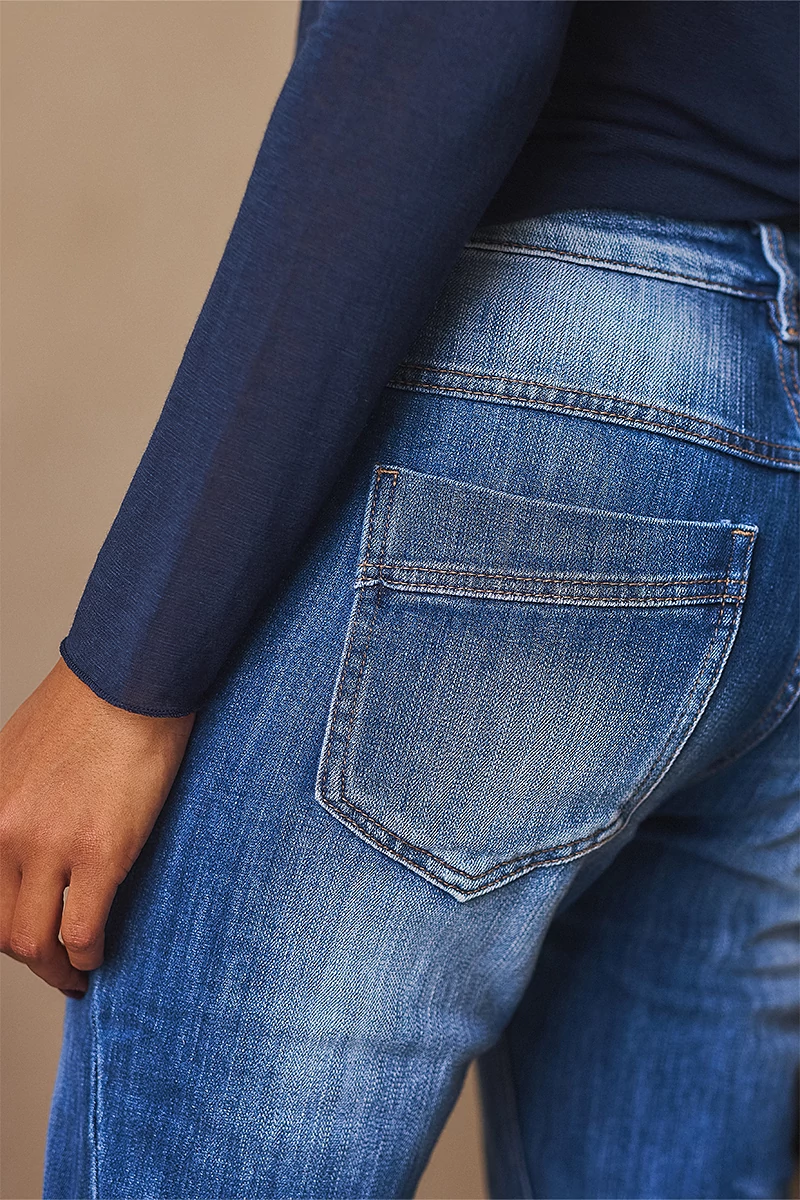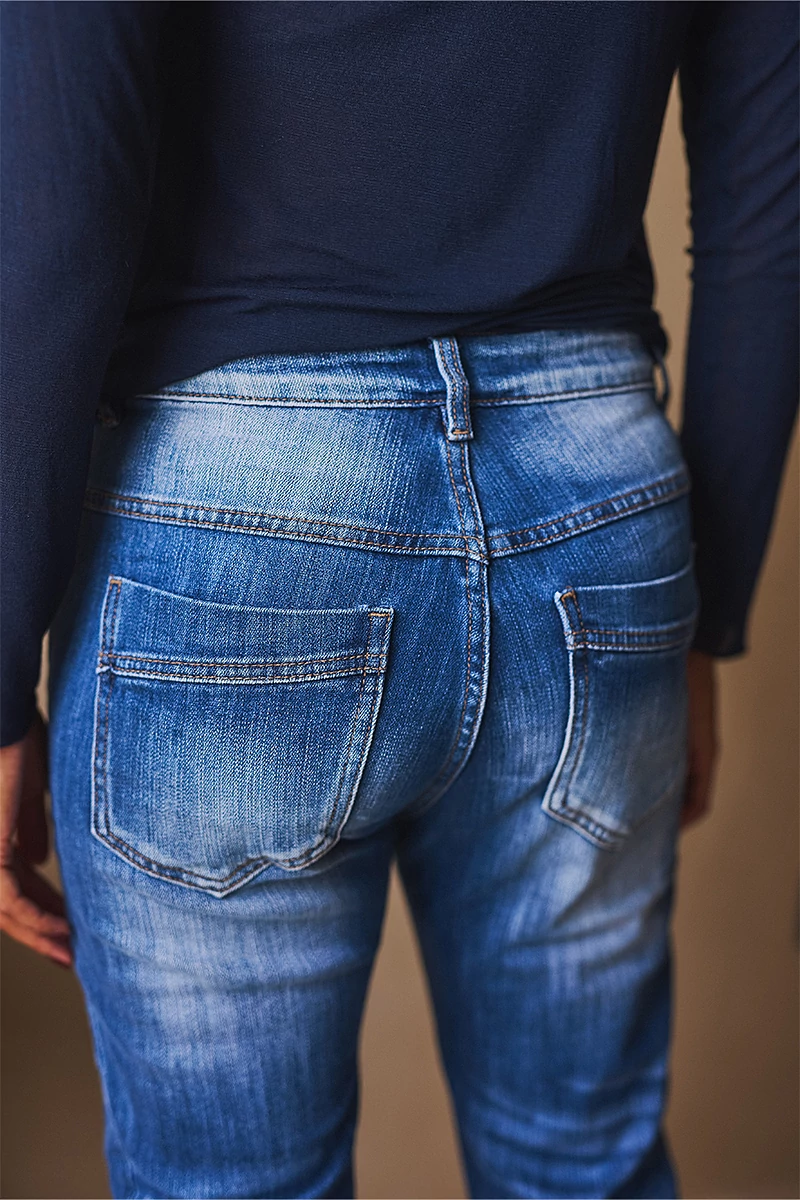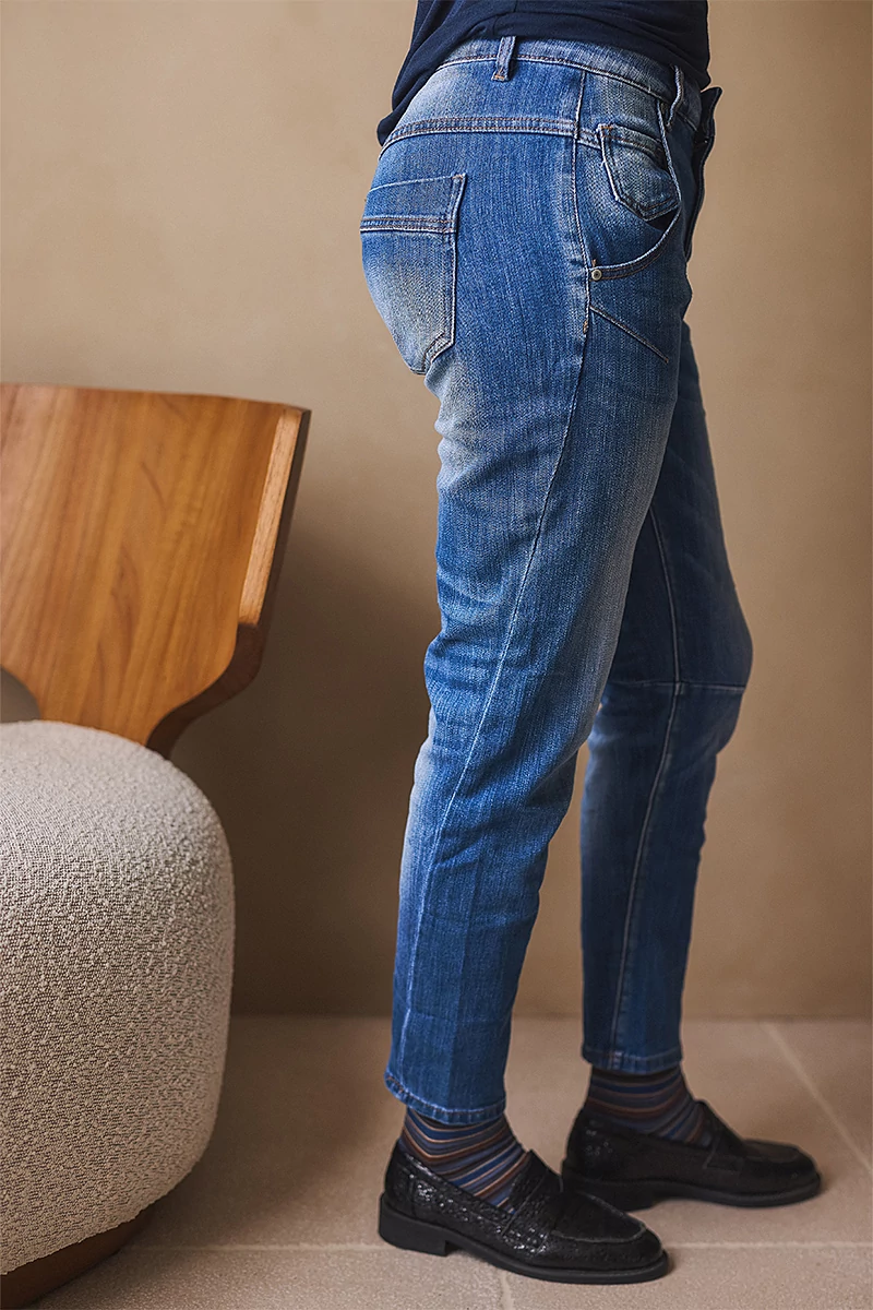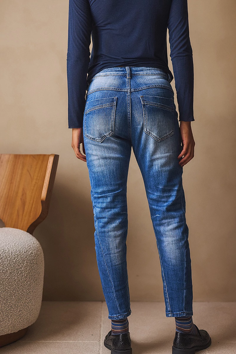 Ez a farmer a lezser vagányság és a kényelem tökéletes darabja. Enyhén ülepes fazonja divatos, modern sziluettet ad, miközben a rugalmas anyag biztosítja a kényelmes viseletet. A koptatások, gyűrések és a különböző irányú bevarrások karakteres, egyedi megjelenést kölcsönöznek, kiemelve a farmer laza, városi stílusát. Klasszikus ötzsebes kialakítása és cipzár-gombos záródása időtálló részlet, amely teljessé teszi a nadrág megjelenését.