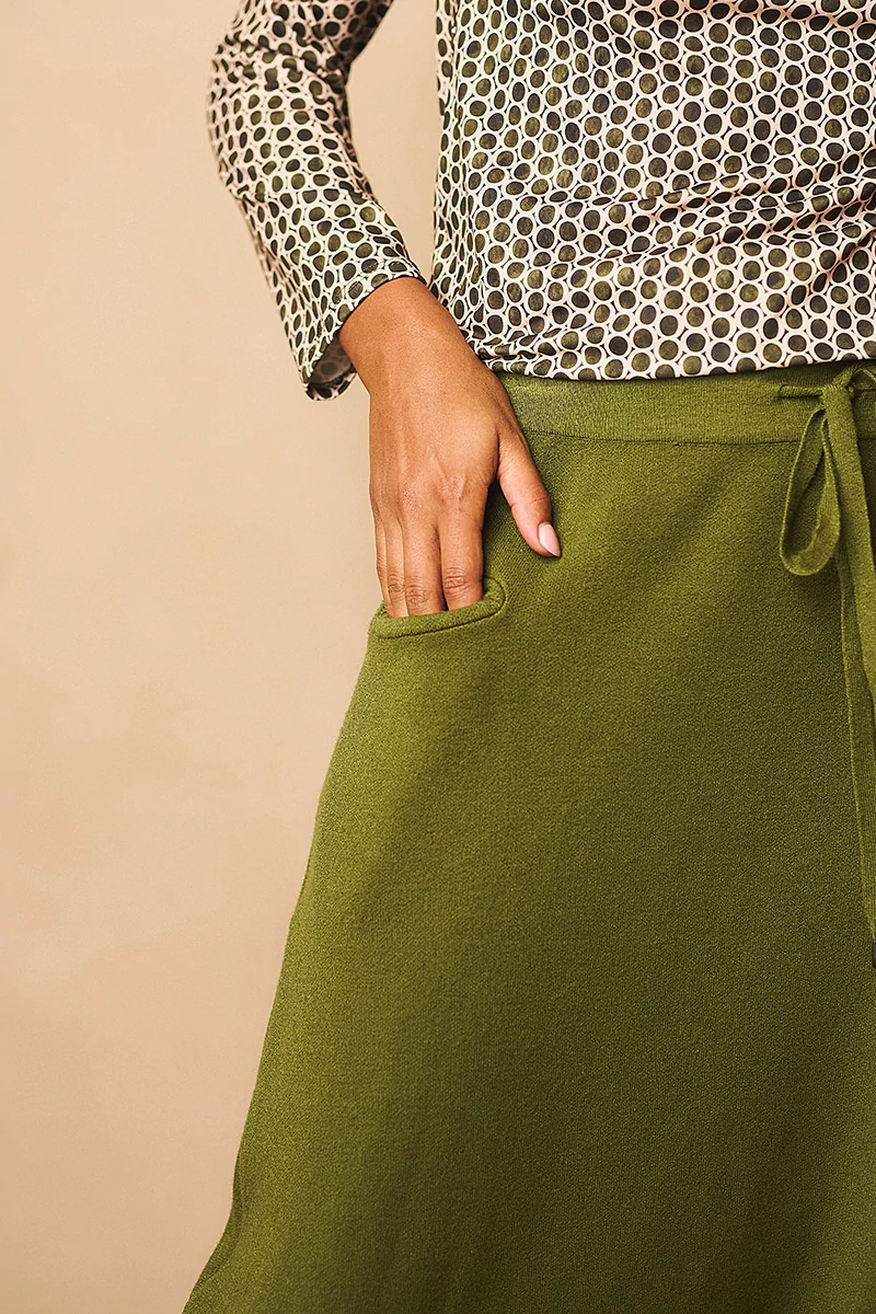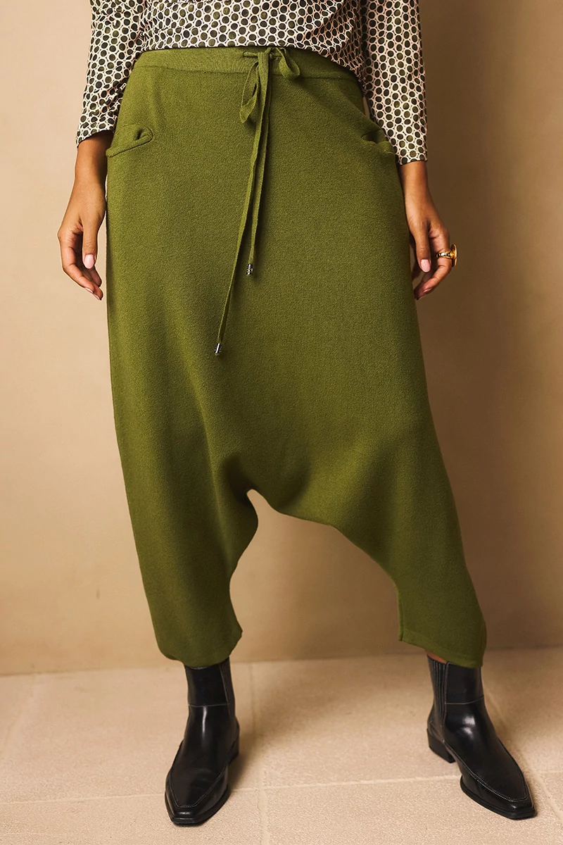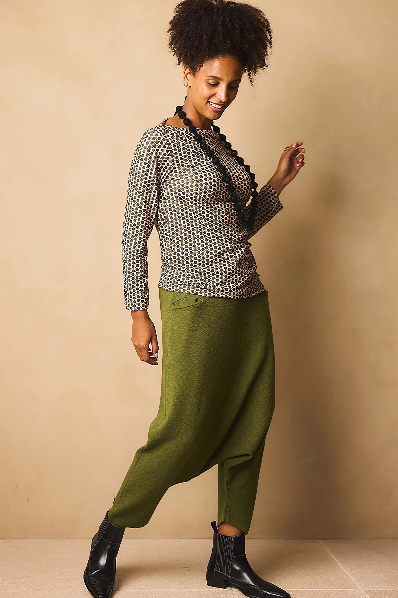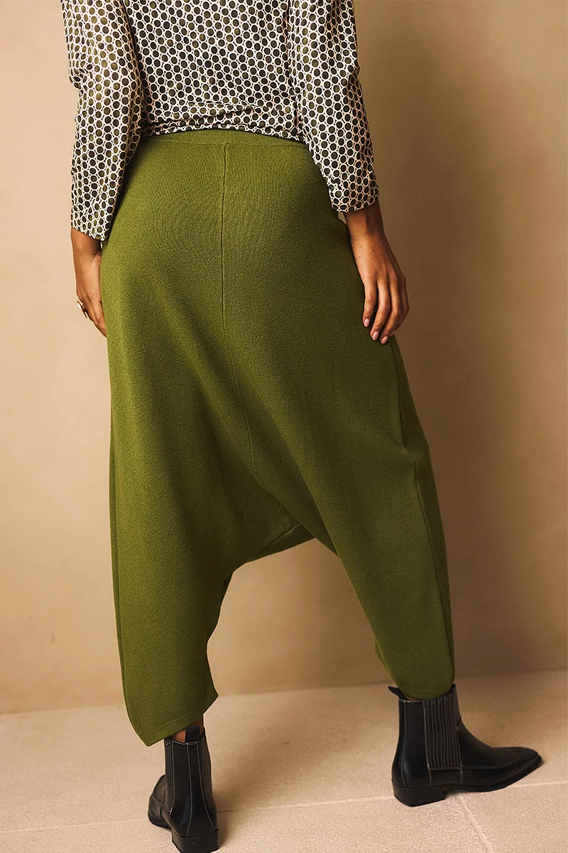 Mélyülepű nadrág gumis, kötős derékrésszel, elöl két vágott, rejtett zsebbel. Anyaga rendkívül rugalmas, meleg, hurkolt, polárszerű viszkóz anyag.