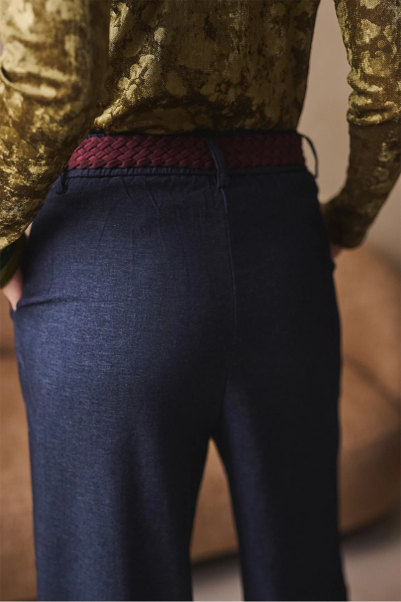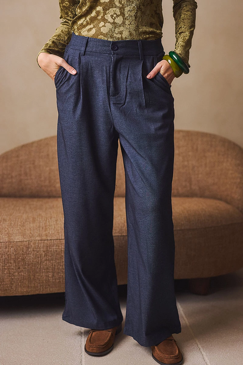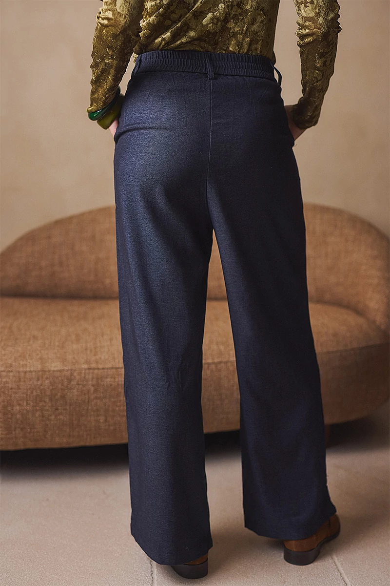 Elegáns, mégis lezser szabású nadrág, amely a derekától induló hajtásokkal lágyan bővül, így természetes esésű, széles szárú fazont alkot. Elöl fix, cipzáros-gombos hátul gumis derékrész klasszikus megoldás praktikus zsebekkel. Kényelmes, könnyed viselet, amelyben a szövet eleganciája és a modern nőiesség találkozik.