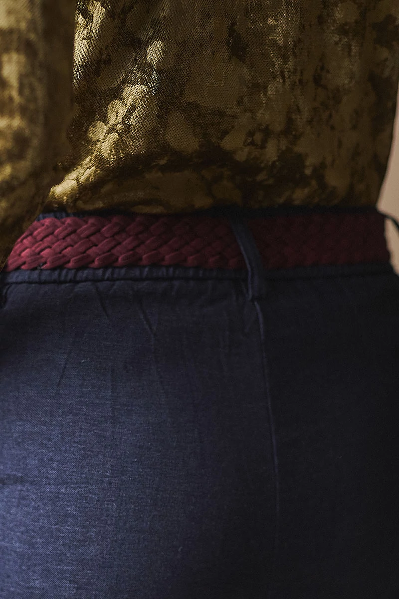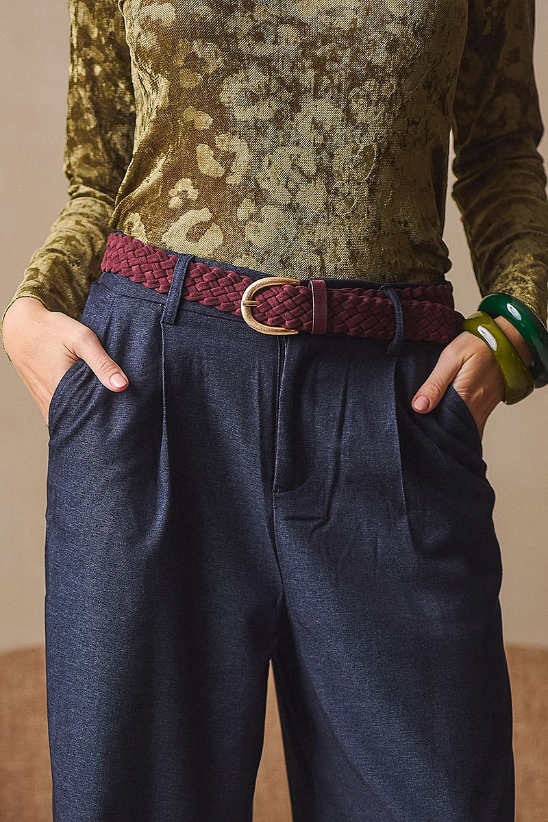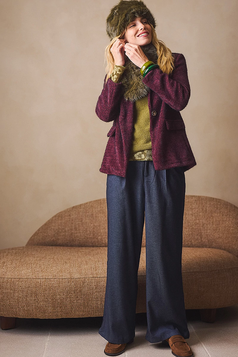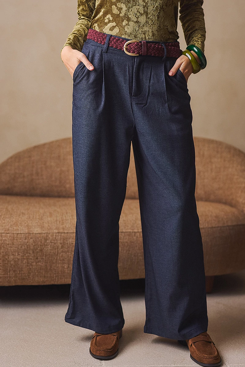 Elegáns, mégis lezser szabású nadrág, amely a derekától induló hajtásokkal lágyan bővül, így természetes esésű, széles szárú fazont alkot. Elöl fix, cipzáros-gombos hátul gumis derékrész klasszikus megoldás praktikus zsebekkel. Kényelmes, könnyed viselet, amelyben a szövet eleganciája és a modern nőiesség találkozik.