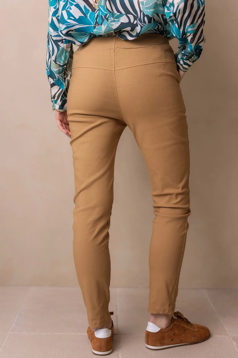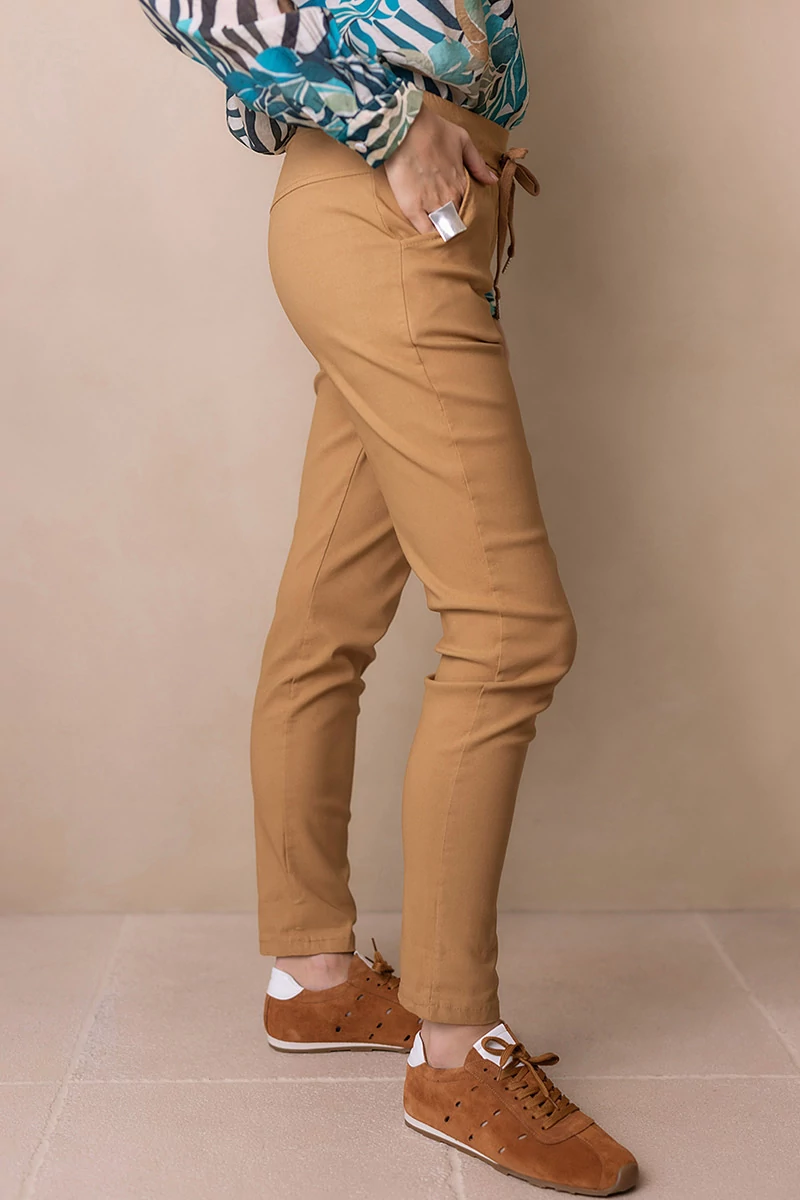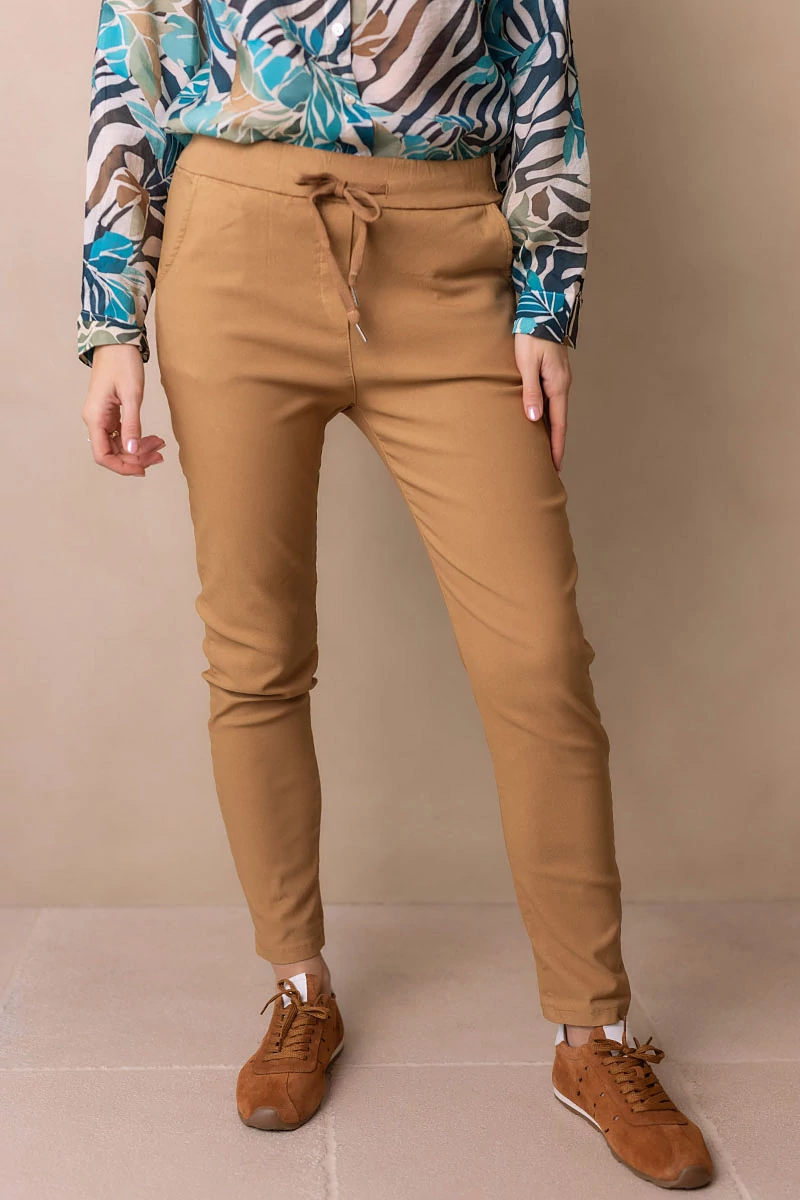 Lezserebb fazonú nadrág rugalmas, enyhén szaténfényű anyagból. Széles, gumis, kötős derékrésze kényelmes viseletet biztosít. Két oldalán praktikus zsebekkel, és a szára enyhén szűkülő. Praktikus, modern és nőiesen laza választás a mindennapokra.