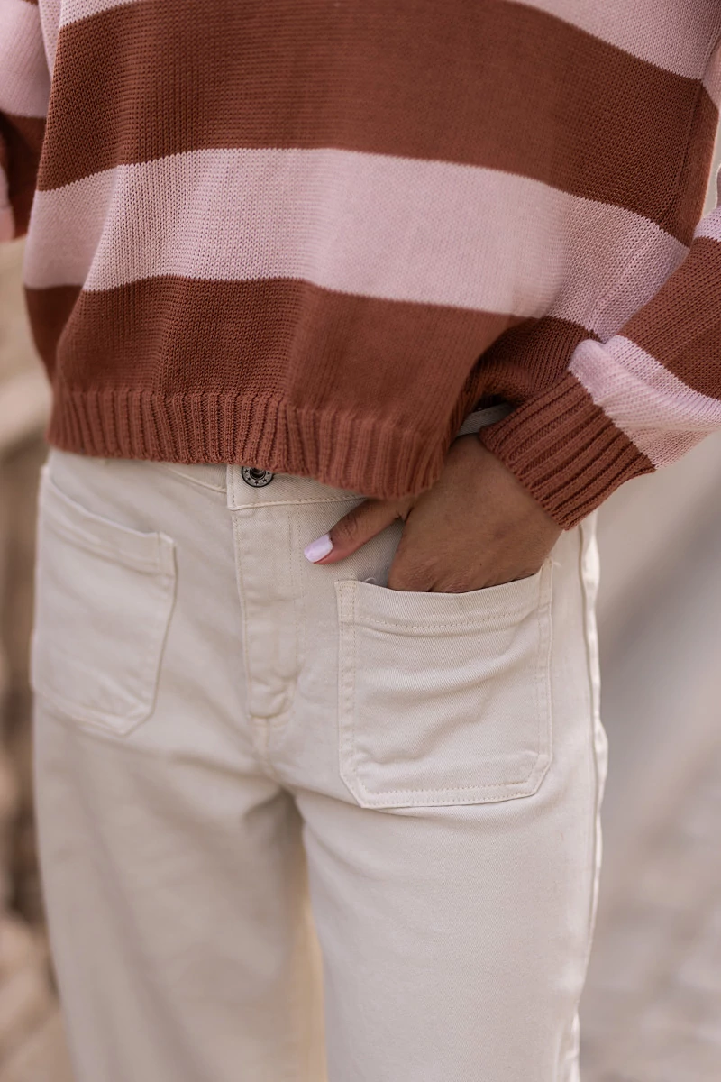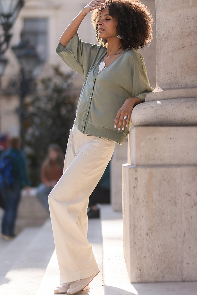 Farmernadrág egyenes bő szárral, magasabb derékrésszel, elöl és hátul 2-2 zsebbel. Elöl cipzárral és gombbal záródik. Az anyaga koptatott, rugalmas farmer.