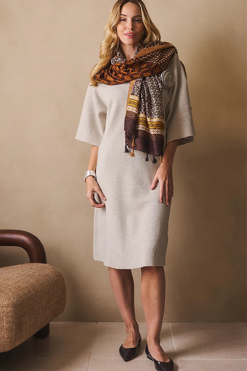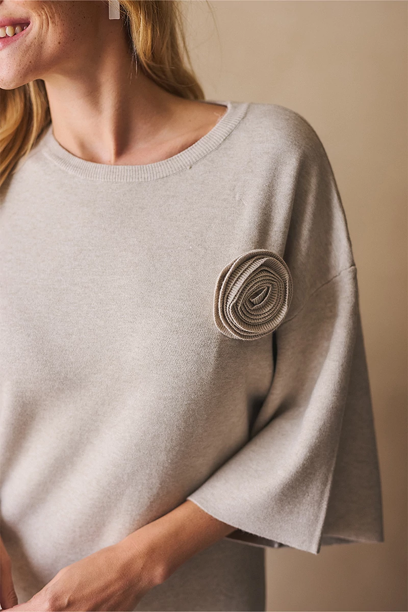 Ez a kötött ruha a letisztultság és a nőies részletek tökéletes egyensúlya.Egyenes vonalú, közepes hosszúságú fazonja kényelmes és elegáns, az 1/2-es bő ujj pedig könnyed mozgást enged. Az alján és az ujja végén passzé nélküli megoldás finom egyszerűséget ad, míg a kerek, passzés nyakkivágás harmonikusan zárja a vonalakat. A levehető, rózsa formájú textil kitűző játékos, romantikus részlet, amely személyessé teszi a darabot.Egy ruha, amelyben természetesen lehetsz elegáns, minden mozdulatában ott van a könnyedség és a női finomság.