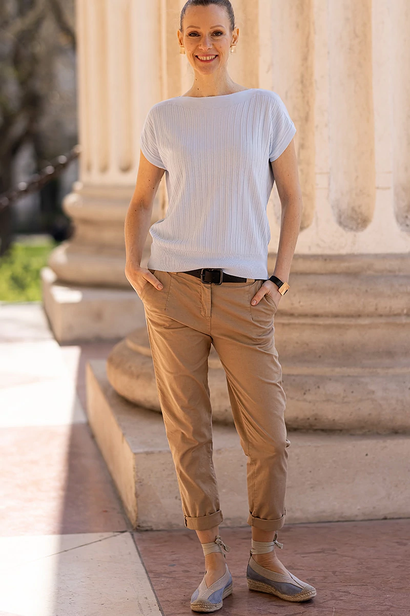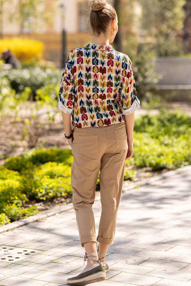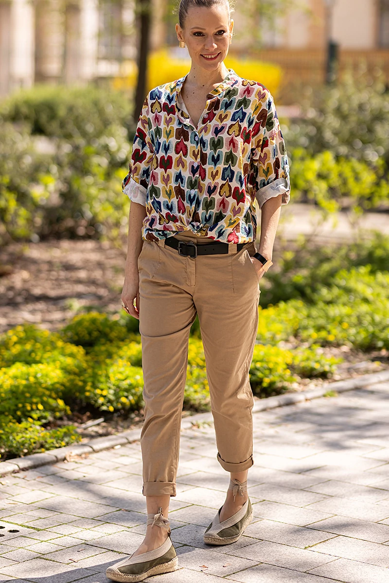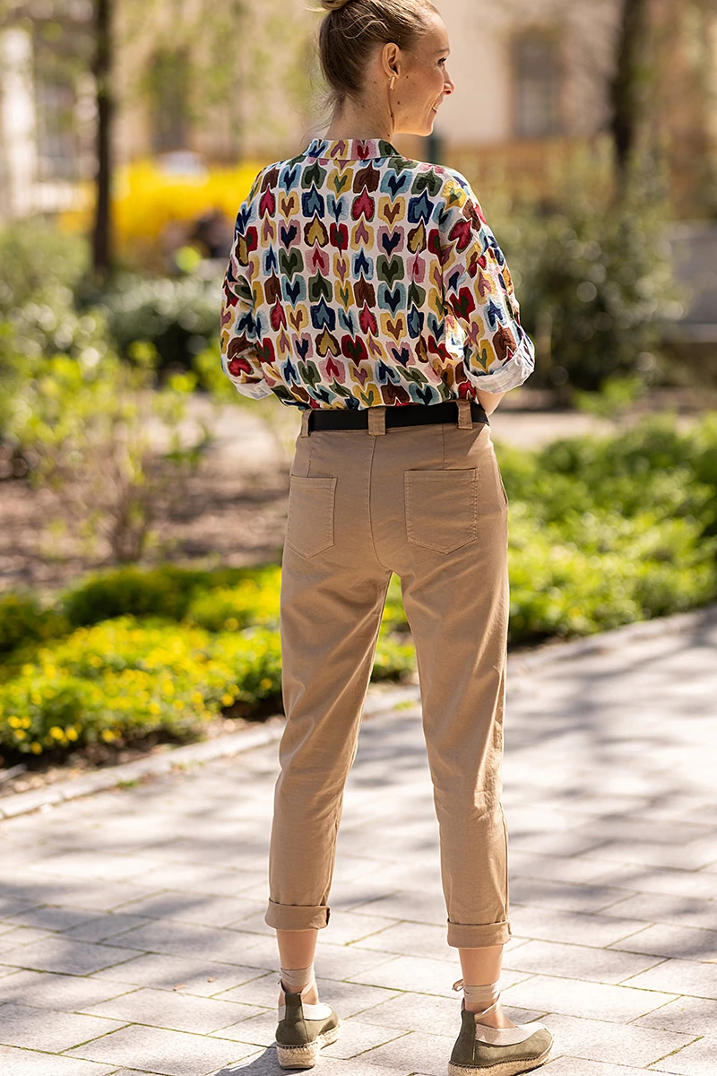 Nadrág, elöl gombbal és cipzárral záródó üleppel, lefele szűkülő szárral, két oldalt vágott svédzsebbel, hátul két zsebbel. A nadrág normál szárhosszúságú. A nadrághoz ajándék egy fémcsatos öv. Az anyaga enyhén rugalmas, formatartó, puha, farmervászon anyag.