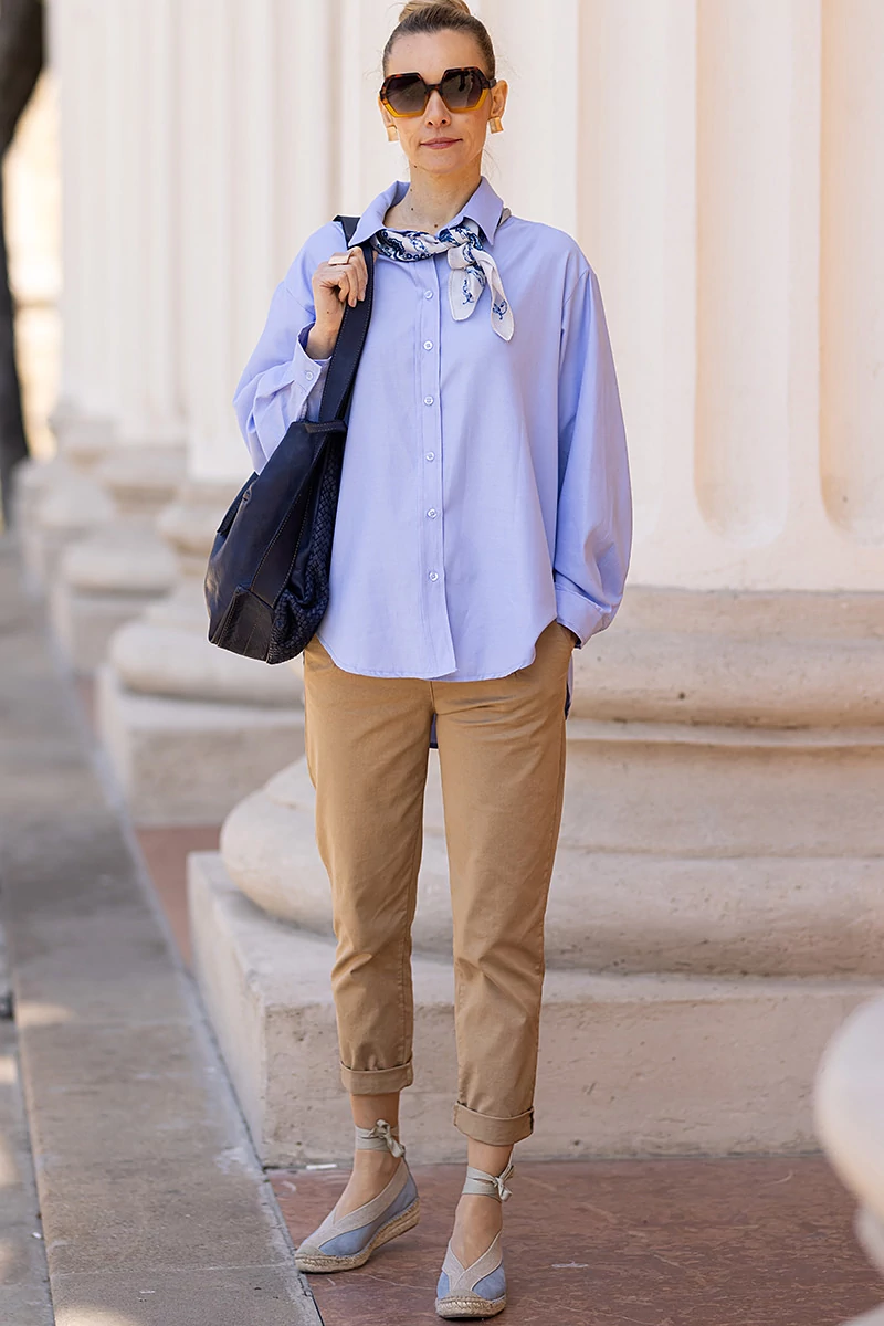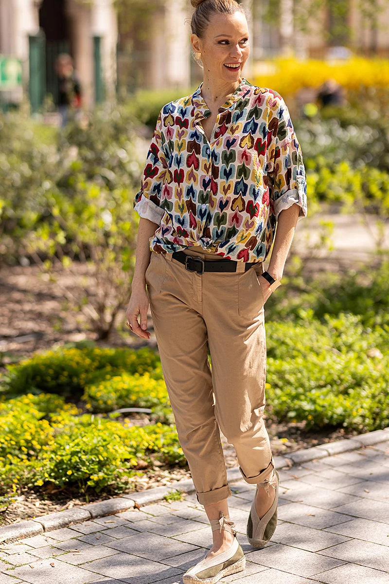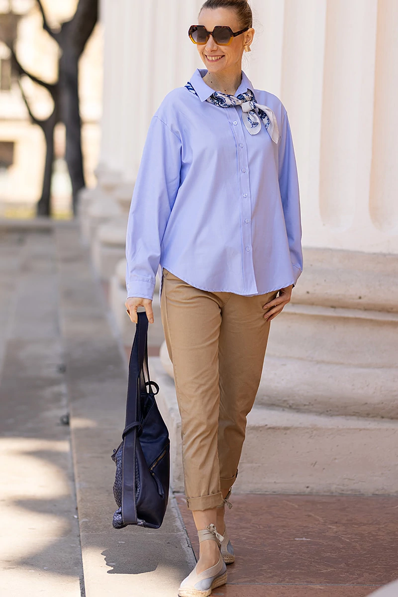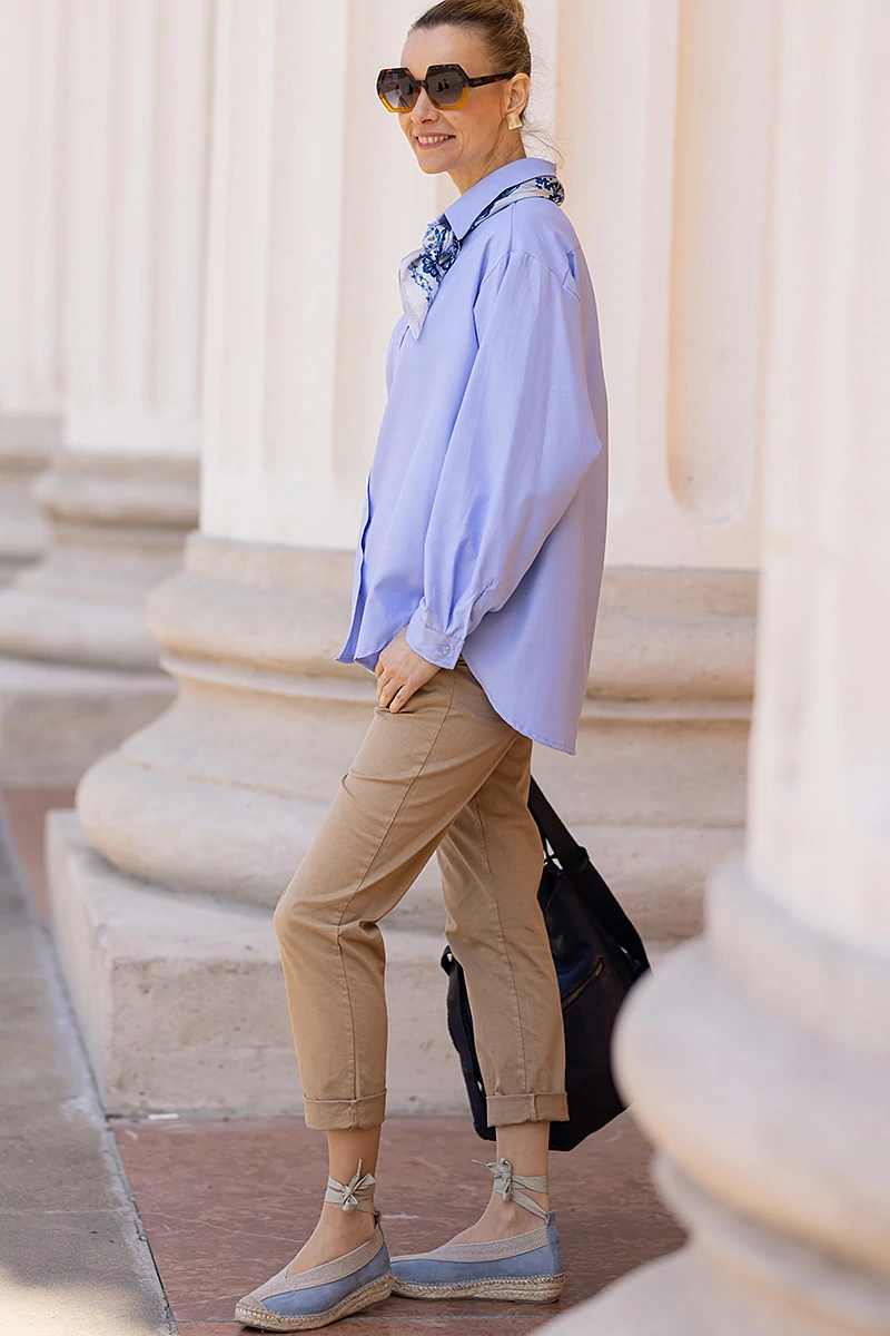 Nadrág, elöl gombbal és cipzárral záródó üleppel, lefele szűkülő szárral, két oldalt vágott svédzsebbel, hátul két zsebbel. A nadrág normál szárhosszúságú. A nadrághoz ajándék egy fémcsatos öv. Az anyaga enyhén rugalmas, formatartó, puha, farmervászon anyag.
