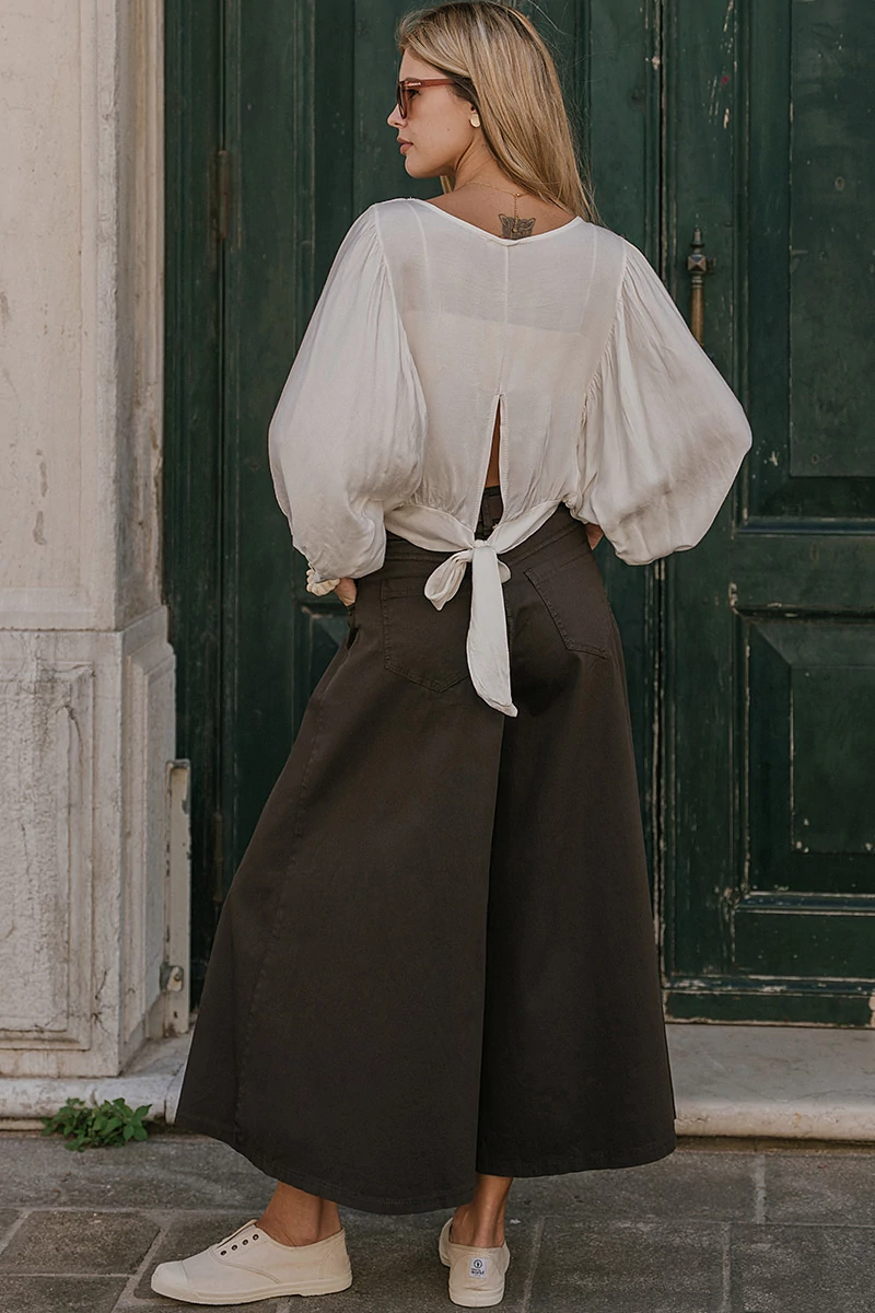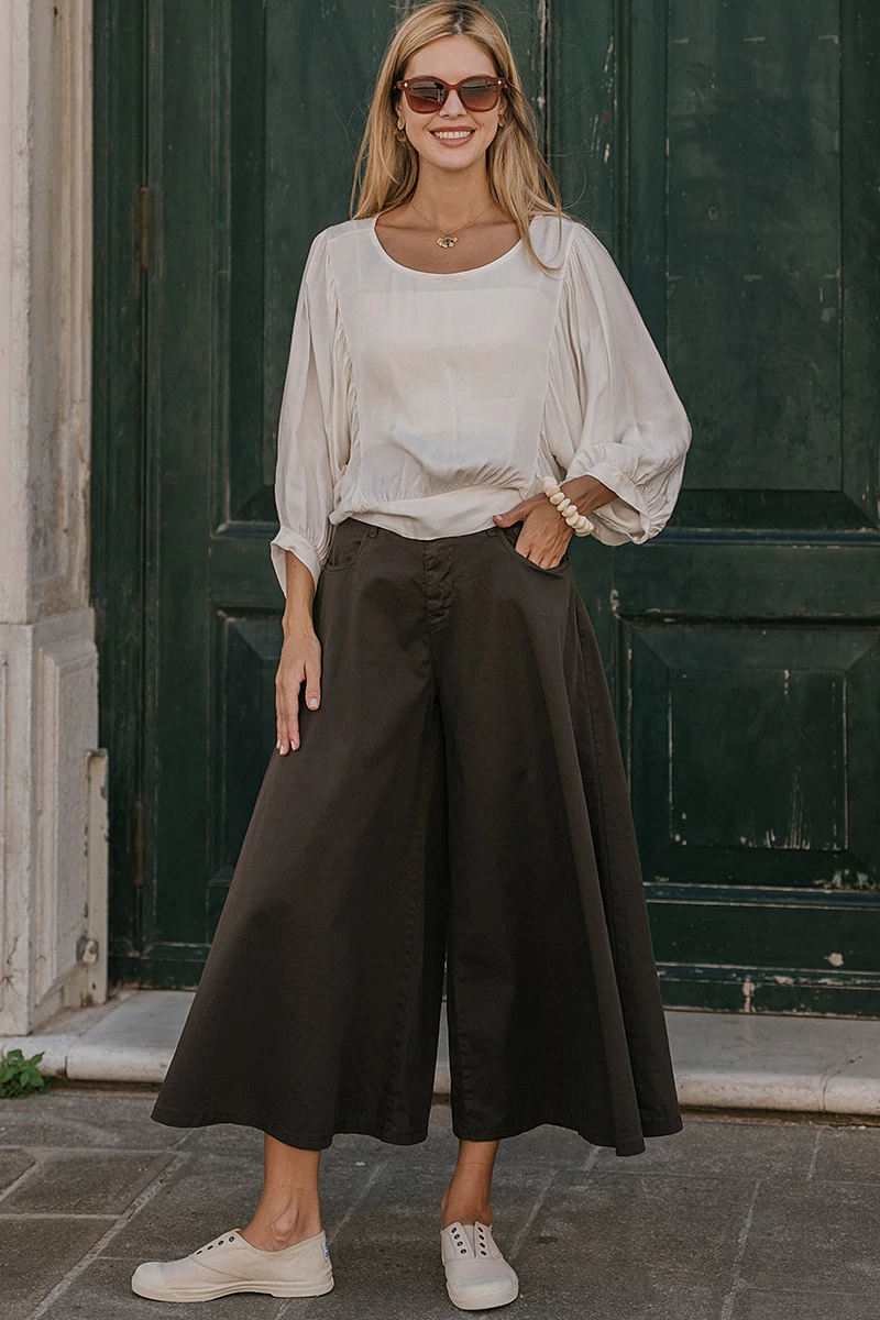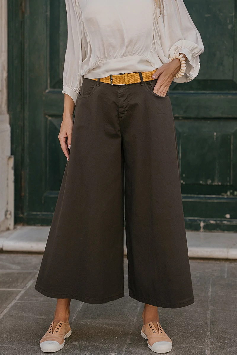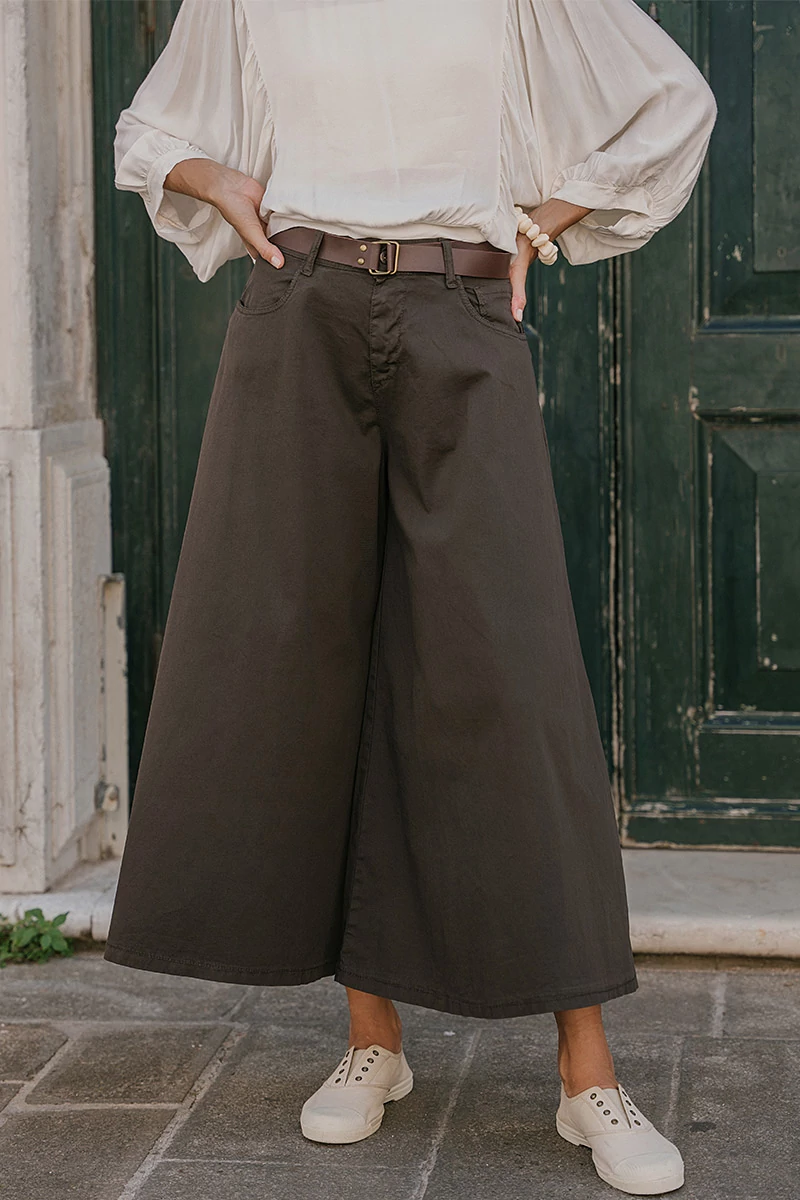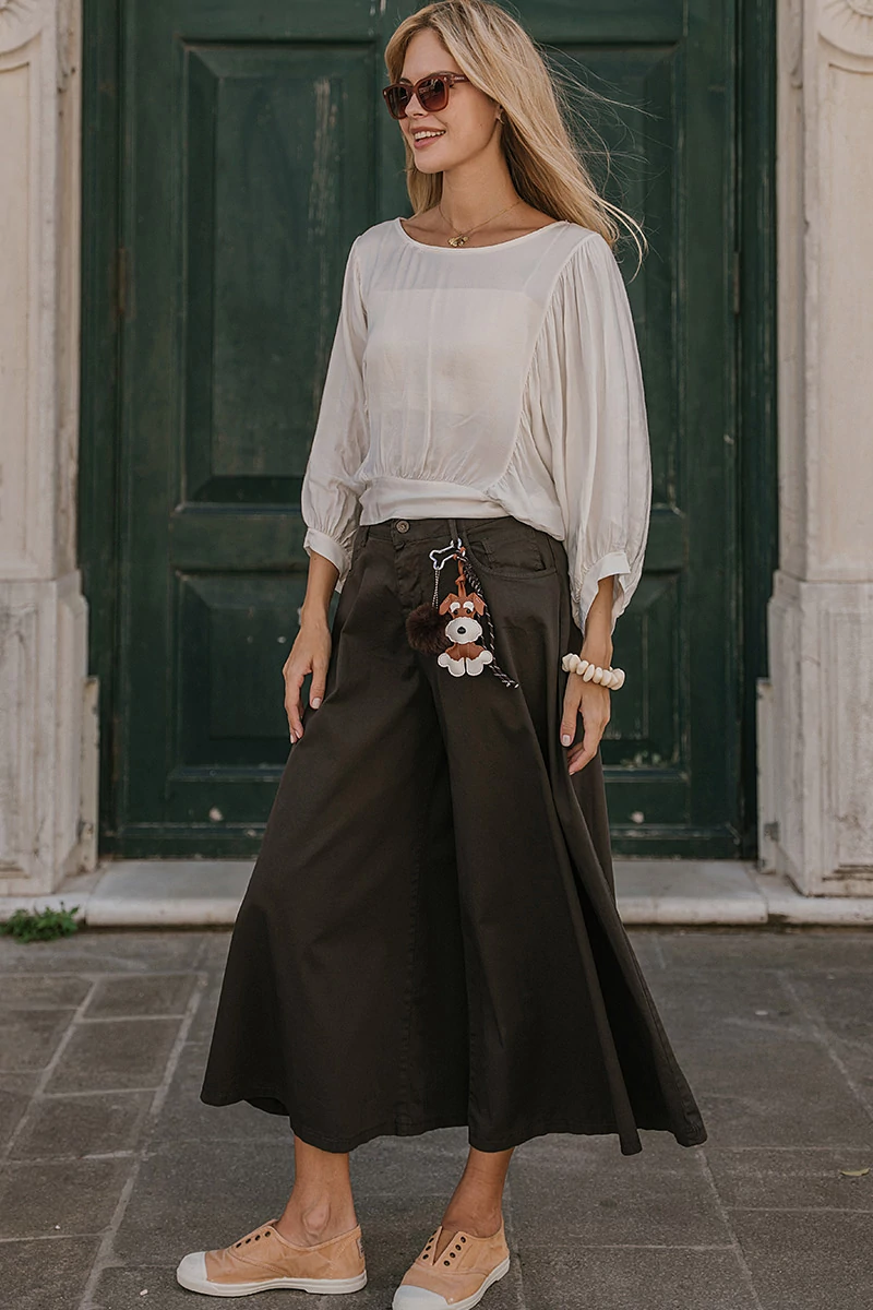 Ötzsebes, lefele bővülő, trapéz szárú nadrág 7/8-os szárhosszal, cipzáros, gombos derékrésszel. A nadrághoz ajándék egy levehető, kedvesfigurás, zsinóros klipsz. A nadrág anyaga rugalmas pamutvászon.