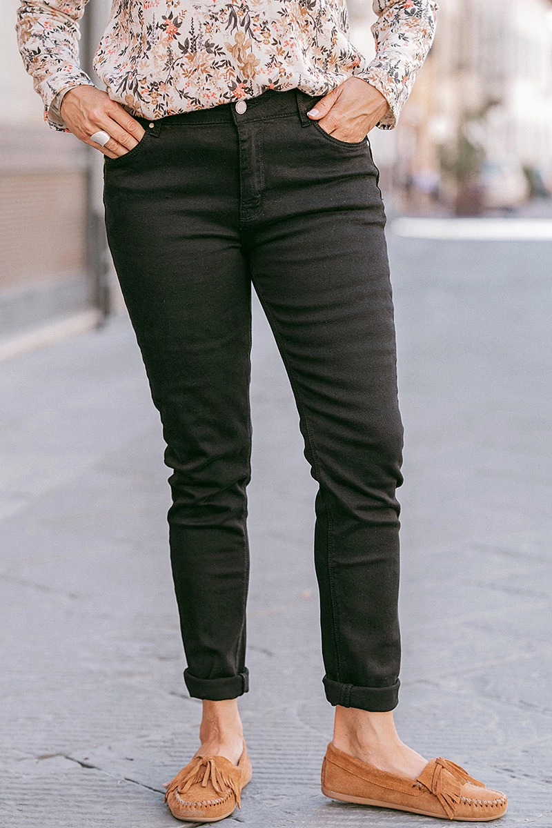 5 zsebes farmer, cipzáros üleppel, gombos, magas derékkal, push up hatással, szűk szárral. A nadrág normál szárhosszúságú.