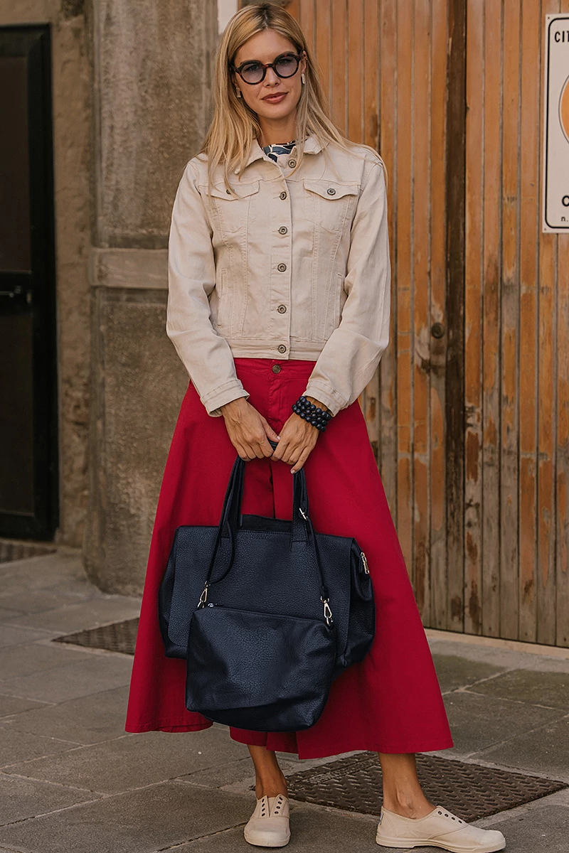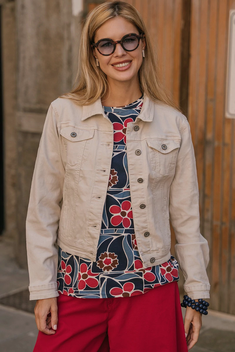 Karcsúsított fazonú, galléros farmerdzseki, mellzsebekkel, oldalzsebekkel. Fém gombokkal záródik. Az anyaga puha és rugalmas farmeranyag.