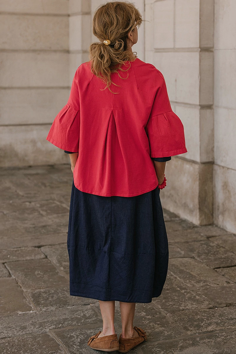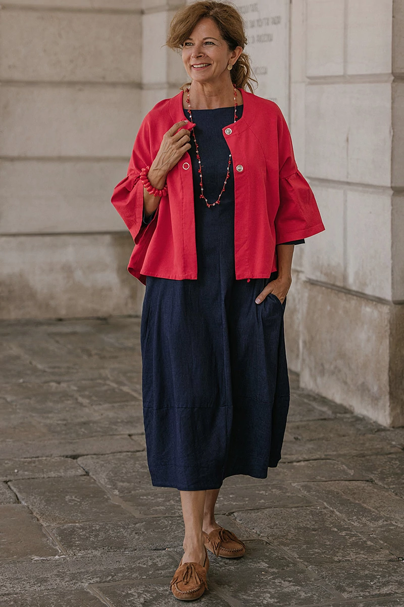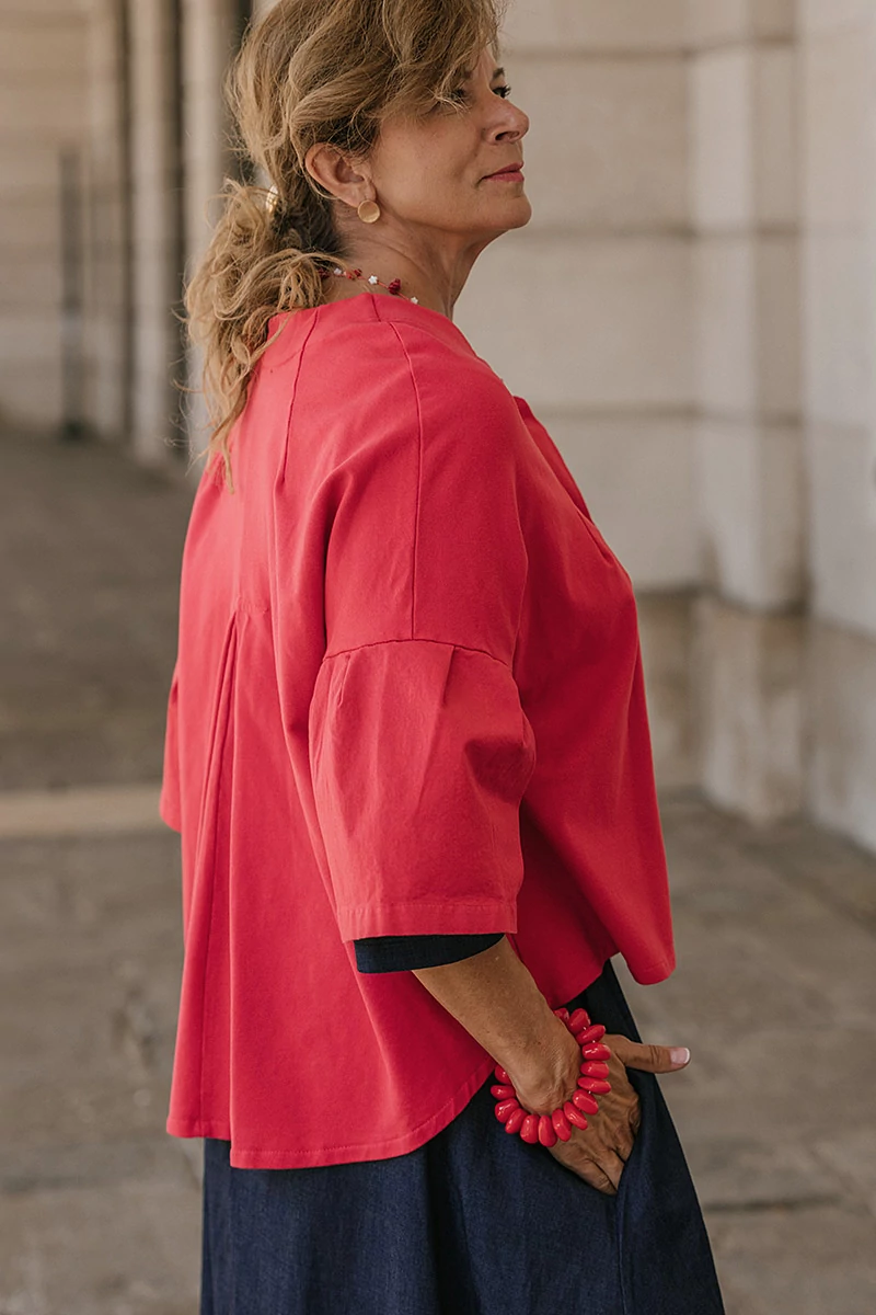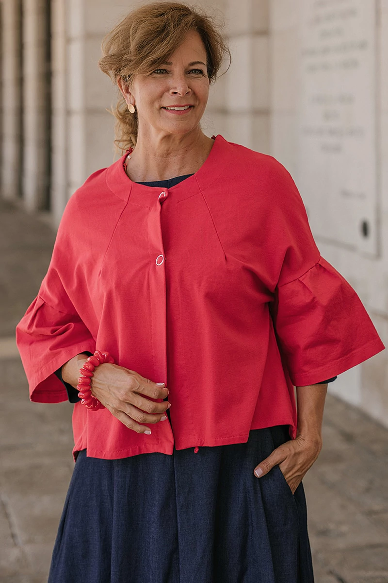 Harang fazonú, hátul ívelten hosszabb pamut kabátka, húzásokkal bővülő pamutvászon, rövidujjal, környakkal. Elöl két patenttal záródik. Az anyaga belül hurkolt, tugalmas pamut.