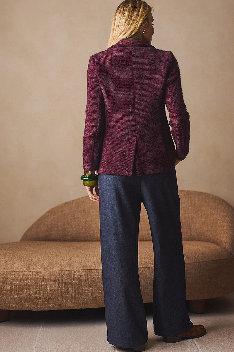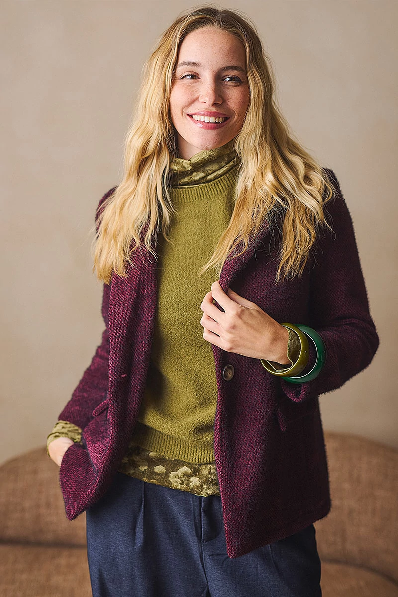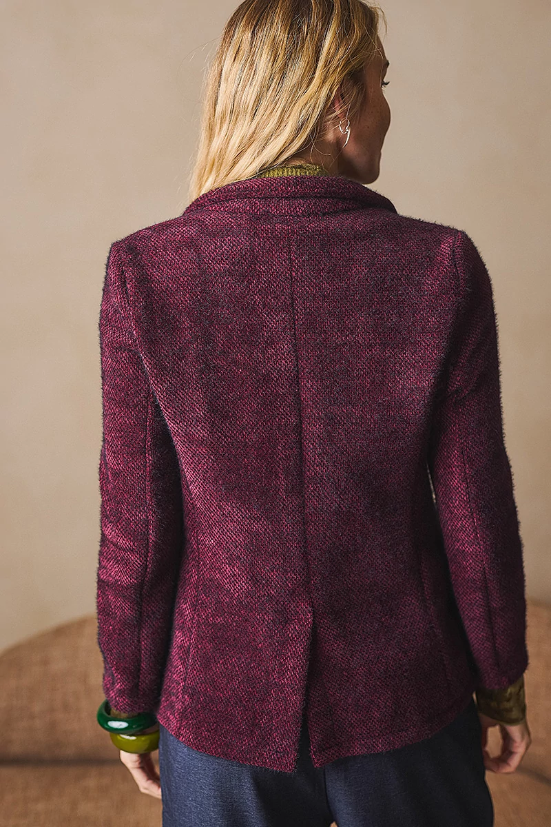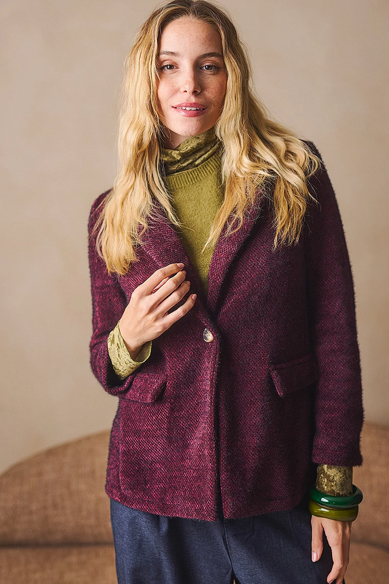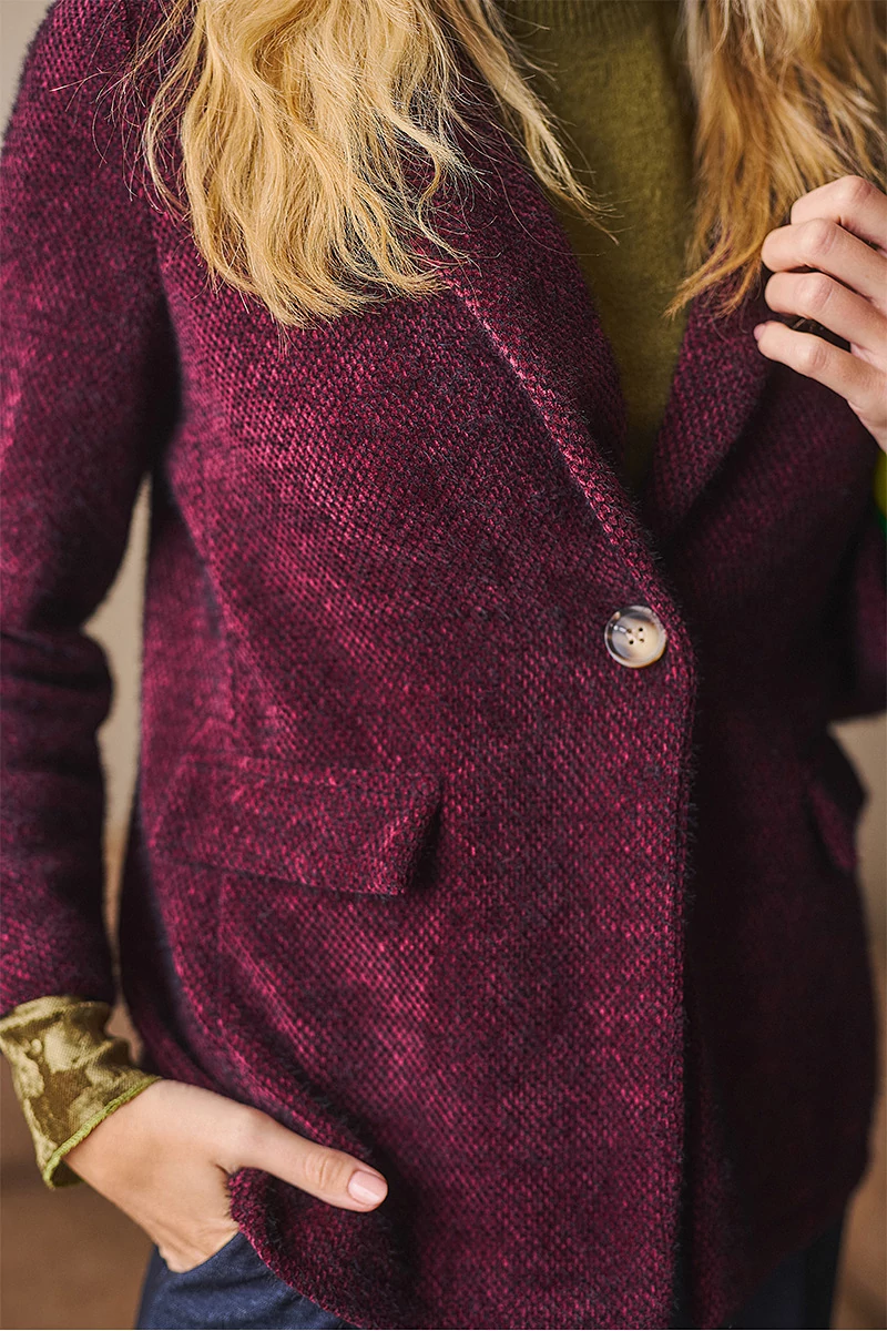 Elegáns komfort minden napra. Ez a béleletlen, galléros blézer az egyszerű vonalak és a kényelmes elegancia tökéletes találkozása. Enyhén testkövető fazonja és a finoman ívelő varrások nőies sziluettet adnak, miközben a közepesen vastag, rugalmas zsenília anyag puhasága gondoskodik a komfortérzetről.